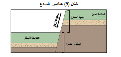 1ـ مستوى الصدع Planet of Fault : السطح الذي تحصل الحركة على امتداده وتكون مستويات الصدع أفقية أو مائلة أو رأسية.