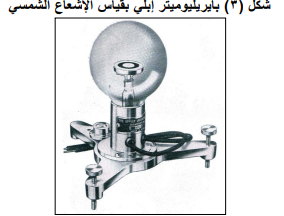 جهاز البايريليوميتر ابلي : تتعدد أجهزة قياس الإشعاع الشمسي ، الا أن أشهرها مـا يـسـمـى ، بايريليوميتر ابلي Eppley pyrheliometer . الذي يتكون من عمود حراري يحتوي في أعلاه على قرصين من المعدن الحساس للأشعة ، احدهما قرص أبيض اللون ، والآخر قرص أسود اللون ، تحيط بهما كرة زجاجية مجوفة ونتيجة لاختلاف العاكسة والامتصاص بين المعدنين ، حيث ان المعدن ذو اللون الأبيض يعكس معظم الإشعاع ، بينما يمتص المعدن ذو اللون الأسود معظمه حيث يقيس الاشعة بوحدة قياس ملي واط /سم او بالسعرة / سم / الدقيقة .