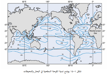 الملوحة : لعل أهم الصفات التي تميز ماء البحر عن الماء العذب هو الملوحة حيث تقدر ملوحة مياه البحار بحوالي ٣٥ جزء في الألف ( ٣٥ ٪ ) وهي تختلف اختلافا طفيفا من مكان الي مكان فالمياه السطحية لوسط الأطلنطي تسجل ملوحة حوالي ٣٧ جزء في الالف بينما يسجل كلا من البحر الأحمر والمتوسط ملوحة حوالي ٤١ جزء في الالف نظرا لتواجدهم في مناطق استوائية تزيد فيها معدلات البخر وقلت الأمطار كما أن هذه البحار تتصل بالمحيط خلال فتحات ضيقة ومن العوامل التي تؤثر على الملوحة البخر العالي وعدم سقوط الامطار .