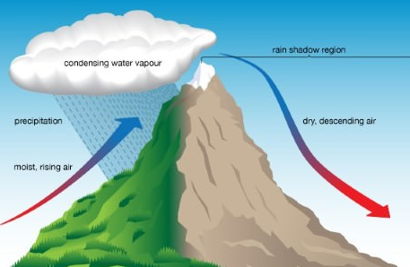 عندما يصادف الهواء المحمّل بالرطوبة سلسلة جبال، يضطر الهواء إلى الارتفاع، فيبرد في المرتفعات الأعلى، وهذا يتسبب بتكاثف بخار الماء الموجود في الهواء وحدوث هطول الأمطار، وإذا كانت درجة الحرارة باردة بدرجة كافية، فقد يكون الهطول على شكل ثلوج.