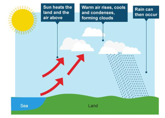يرتفع الهواء بشكل طبيعي عندما يسخن، وعندما يصل إلى ارتفاعات أعلى يبرد، لا يمكن للهواء البارد الاحتفاظ بالرطوبة بقدر الهواء الدافئ، لذلك تتكثف الرطوبة في السحب المعروفة باسم السحب الركامية، وفي النهاية، تصبح الغيوم محملة بقطرات الماء بالحجم الذي يجعلها تتساقط على شكل أمطار، ويمكن أن يحدث هذا فوق الأرض أو فوق الماء طالما أن الرطوبة موجودة، وعندما يحدث فوق المحيطات الاستوائية، حيث الهواء المتشبع ببخار الماء، والحرارة الشديدة التي تسبب تيارات…