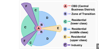 من النظريات التي عالجت الاستخدام التجاري - نظرية القطاعات المركزية(هومرهويت)عام 1939: فيؤكد على أن التركيب الداخلي للمدينة تحكم الطرق التي تخرج من قلب المدينة باتجاه الأطراف وأكد على ايجار الأرض بوصفه انعكاسا لقيمتها وان النمو يكون حول منطقة الاعمال المركزية (CBD).