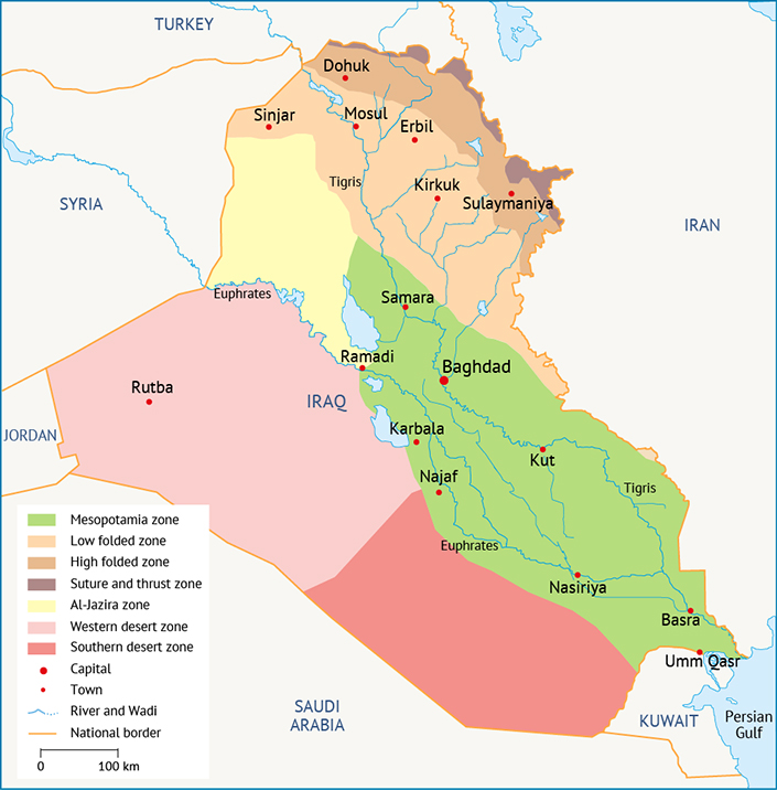 السهول الفيضية لنهري دجلة والفرات: تمتد هذه السهول الفيضية لمسافة 650كم وبعرض 250كم من الشمال الغربي نحو الجنوب الشرقي وتبلغ مساحتها 93 الف كم2 (20% من مساحة العراق). ويتراوح ارتفاعها بين مستوى سطح البحر و100م. والسهول الفيضية لنهري دجلة والفرات تكاد تكون مستوية تماماً سوى بعض التلال المبعثرة. وقد كانت هذه السهول تمثل قسماً من الخليج العربي في عصر البلايستوسين، الا ان الرواسب الهائلة التي جلبتها الانهار ملأت هذه المناطق مكونة سهلاً رسوبياً فيضياً يبلغ سمكة مئات الامتار.