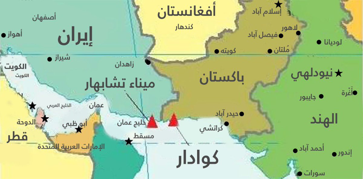 ميناء جوادر: يقع جنوب غرب باكستان يطل على بحر العرب بالقرب من مضيق هرمز والذي تعبر منه ثلث تجارة النفط العالمية وفي السابق كان تحت سيطرة عمان منذ عام 1779 لكنه اصبح ملكا لباكستان مع حلول عام 1958.