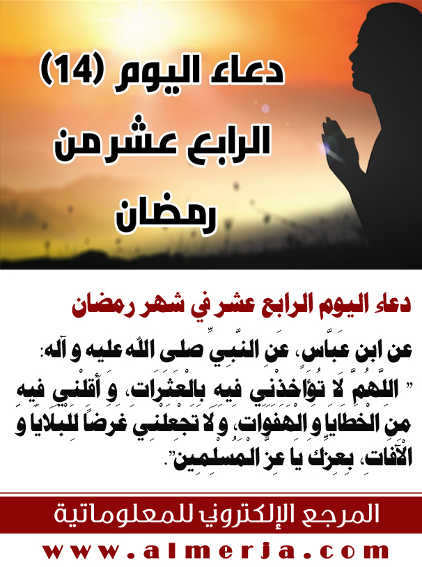 دعاء اليوم الرابع عشر من شهر رمضان/ عن ابن عَبَّاسٍ، عَنِ النَّبِيِّ صلى الله عليه و آله: