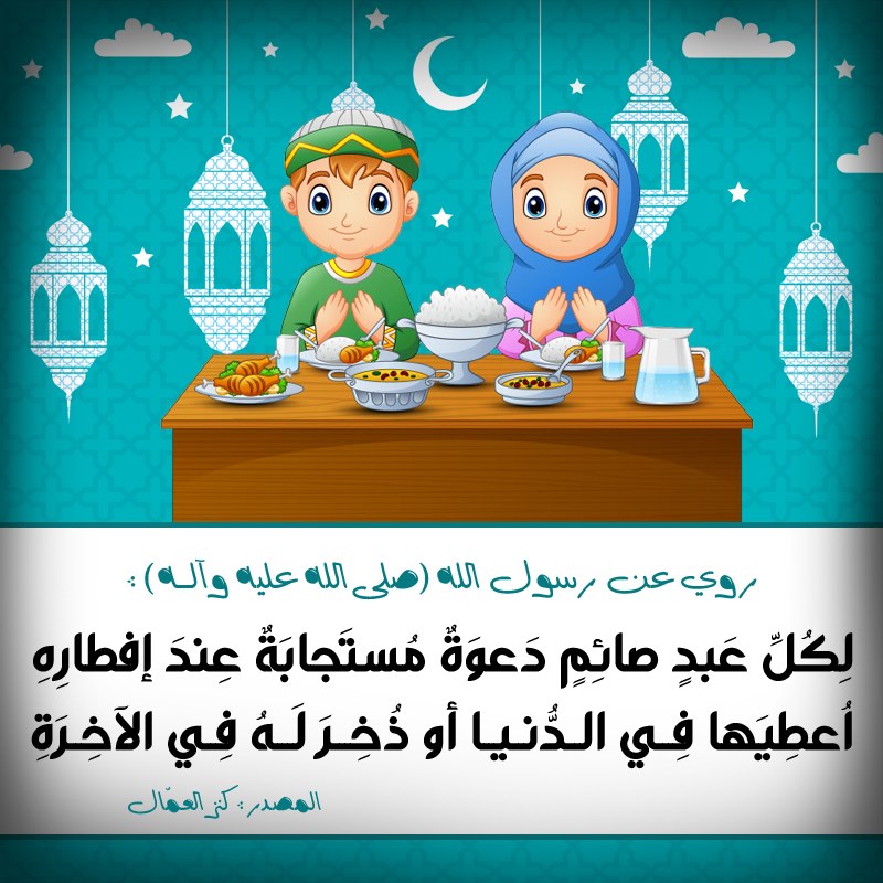 روي عن رسول الله ( صلى الله عليه و آله ) أنهُ قَالَ : لِكُلِّ عَبدٍ صائِمٍ دَعوَةٌ مُستَجابَةٌ عِندَ إفطارِهِ ، اُعطِيَها فِي الدُّنيا أو ذُخِرَ لَهُ فِي الآخِرَةِ .