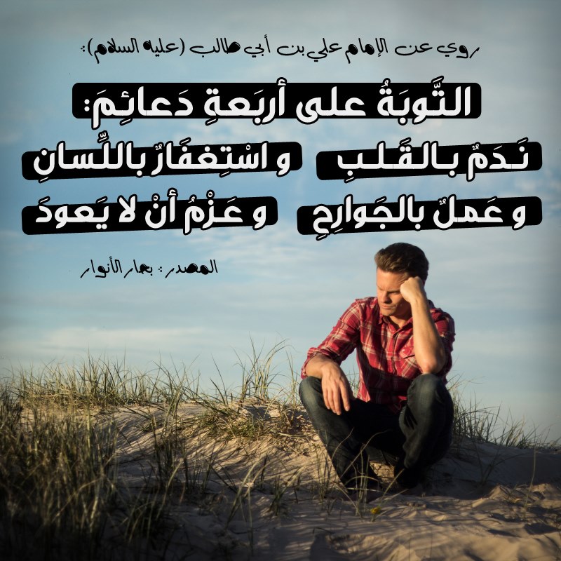 رُوِيَ عَنْ الإمام عَلِيِّ بْنِ أَبِي طَالِبٍ ( عليه السَّلام ) أنهُ قَالَ : التَّوبَةُ على أربَعةِ دَعائِمَ : نَدَمٌ بالقَلبِ ، و اسْتِغفَارٌ باللِّسانِ ، و عَملٌ بالجَوارِحِ ، و عَزْمُ أنْ لا يَعودَ .