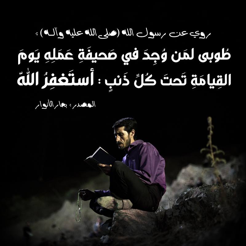 روي عن رسول الله ( صلى الله عليه و آله ) أنهُ قَالَ : طُوبى لمَن وُجِدَ في صَحيفَةِ عَمَلِهِ يَومَ القِيامَةِ تَحتَ كُلِّ ذَنبٍ : أستَغفِرُ اللّه َ.