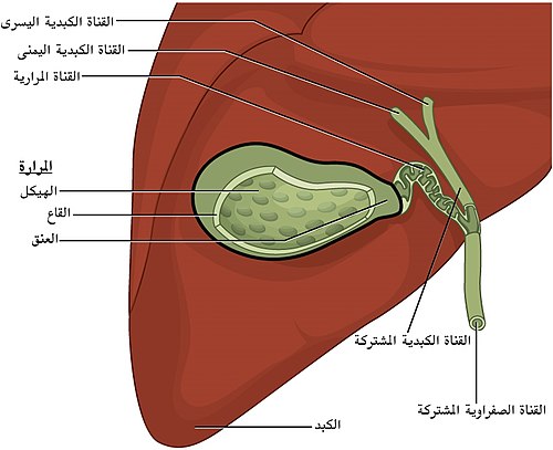 المرارة: عبارة عن تركيب يشبه الكيس يقع تحت الكبد وتقوم بخزن العصارة الصفراوية المصنوعة في الكبد في داخلها ويتسع الي 50 مل وهو قابل للتمدد. تفتح القناة المرارية في الاثني عشري وتلتحم مع القناة البنكرياسية. ويقدر مايفرزه الكبد من العصارة الصفراوية بحوالي 0.5 ــ 1 لتر يوميا تتكون بالاساس من املاح الصفراء وكوليسترول احماض دهنية، بينما تحتوي عصارة المرارة علي 85% ماء، 9% احماض الصفراء، 3% صبغيات، 0.26 كوليسترول، 0.3 احماض دهنية، 0.6 املاح غير عضوية وهذا المزيج يعمل على اذابة الدهون ليسهل امتصاصها