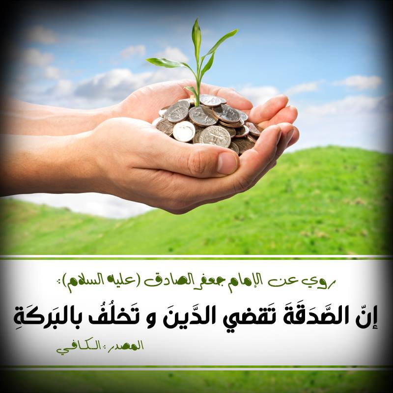 الإمام جعفر بن محمد الصادق ( عليه السلام ) أنهُ قَالَ : إنّ الصَّدَقَةَ تَقضي الدَّينَ و تَخلُفُ بالبَركَةِ .