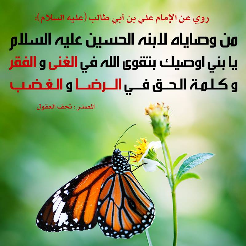 الإمام عَلِيِّ بْنِ أَبِي طَالِبٍ ( عليه السَّلام ) أنهُ قَالَ : مِن وصاياهُ لابْنِهِ الحُسينِ عليه السلام ـ: يا بُنيَّ ، اُوصيكَ بتَقْوى اللّه ِ في الغِنى و الفَقرِ ، و كَلِمَةِ الحقِّ في الرِّضا و الغَضَبِ .