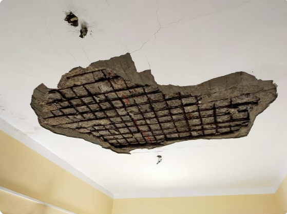 - شروخ طولية وموازية للكمرات على السطح السفلي للبلاطة نتيجة عدم كفاية اطوال رباط اسياخ التسليح بين البلاطة والكمرة.