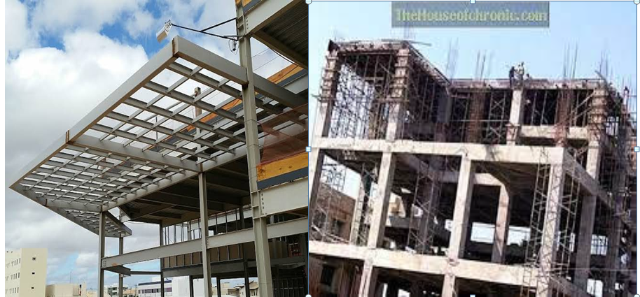 - الهيكل المعدني: من خصائصه المعادن تتحمل اجهادات الشد والضغط بدرجة كبيرة وسرعة التركيب وخفة وزنه ويوفر مساحات و فضاءات كبيرة داخل المباني لصغر ابعاد الهياكل المعدنية ولايحتاج لاسس ضخمه.