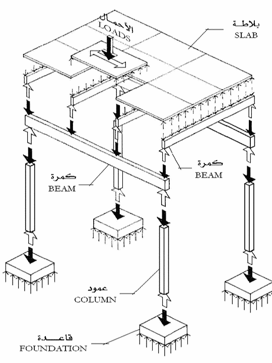 تنتقل الأحمال من الاسقف الى الجسور ثم الأعمدة ثم الى الأسس . ولا يكون للجدران الطابوقية أي دور في نقل الأحمال انما تستخدم لغرض التقطيع الداخلي.