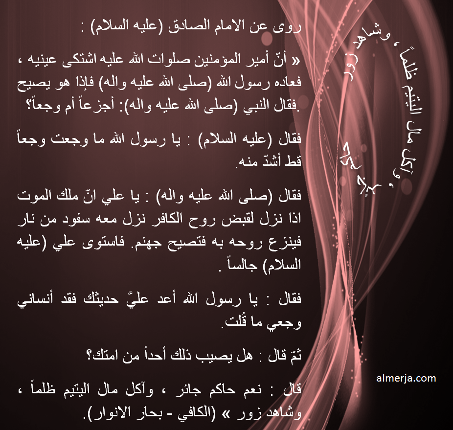 روى عن الامام الصادق (عليه السلام) : « أنّ أمير المؤمنين صلوات الله عليه اشتكى عينيه ، فعاده رسول الله (صلى الله عليه واله) فإذا هو يصيح فقال النبي (صلى الله عليه واله): أجزعاً أم وجعاً؟ فقال (عليه السلام) : يا رسول الله ما وجعت وجعاً قط أشدّ منه. فقال (صلى الله عليه واله) : يا علي انّ ملك الموت اذا نزل لقبض روح الكافر نزل معه سفود من نار فينزع روحه به فتصيح جهنم. فاستوى علي (عليه السلام) جالساً فقال : يا رسول الله أعد عليَّ حديثك فقد أنساني وجعي ما قُلت.