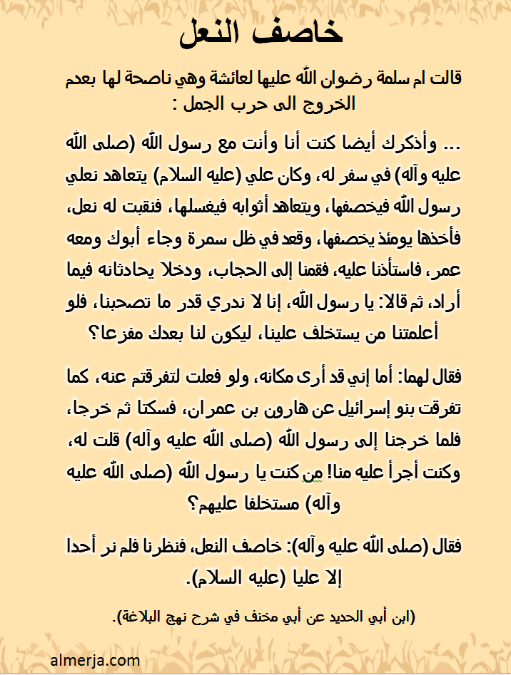 خاصف النعل : قالت ام سلمة رضوان الله عليها لعائشة وهي ناصحة لها بعدم الخروج الى حرب الجمل :