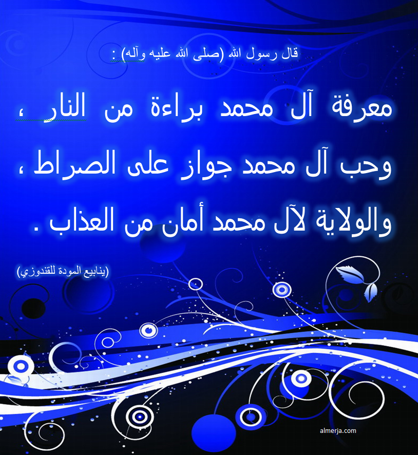 معرفة آل محمد براءة من النار ، وحب آل محمد جواز على الصراط ، والولاية لآل محمد أمان من العذاب .