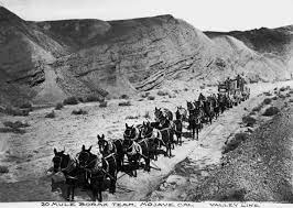 With the discovery of borax in Death Valley, CA in the early 1890s, William Tell Colemans company used the famous 20-mule teams to haul the product to the nearest rail junction - - Mojave, CA. Two 10-mule teams were hitched together to form a 100-foot long 20-mule team. Between 1883 and 1889, Colemans teams hauled two 16-foot long wagons loaded with borax, plus a 1,200 gallon water tank (with a total weight of over 36 tons)