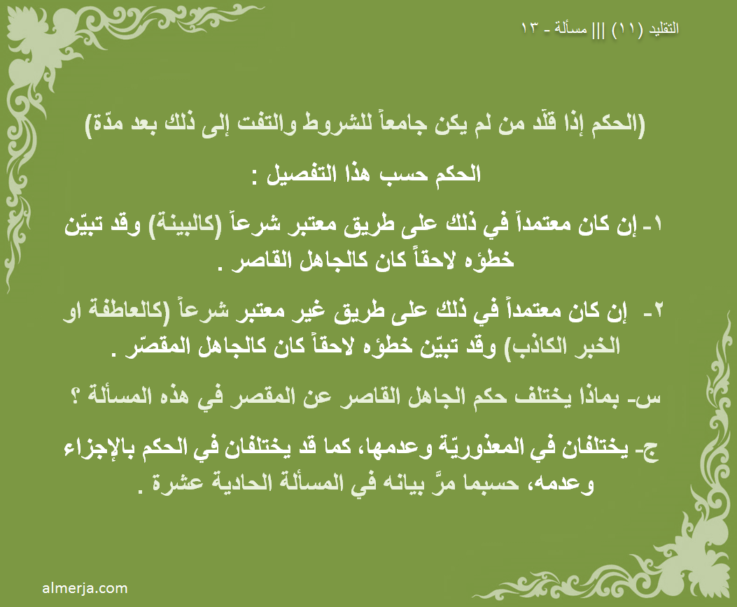 2- إن كان معتمداً في ذلك على طريق غير معتبر شرعاً (كالعاطفة او الخبر الكاذب) وقد تبيّن خطؤه لاحقاً كان كالجاهل كالمقصّر .