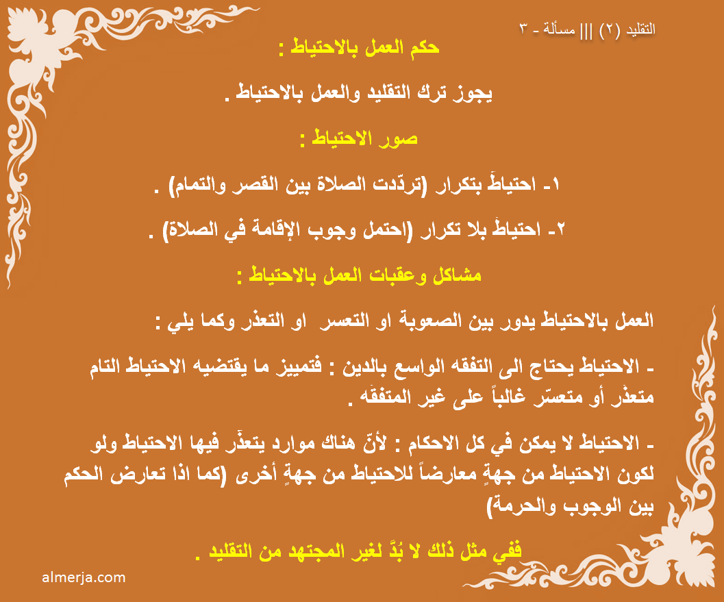 - الاحتياط يحتاج الى التفقه الواسع بالدين : فتمييز ما يقتضيه الاحتياط التام متعذّر أو متعسّر غالباً على غير المتفقّه .