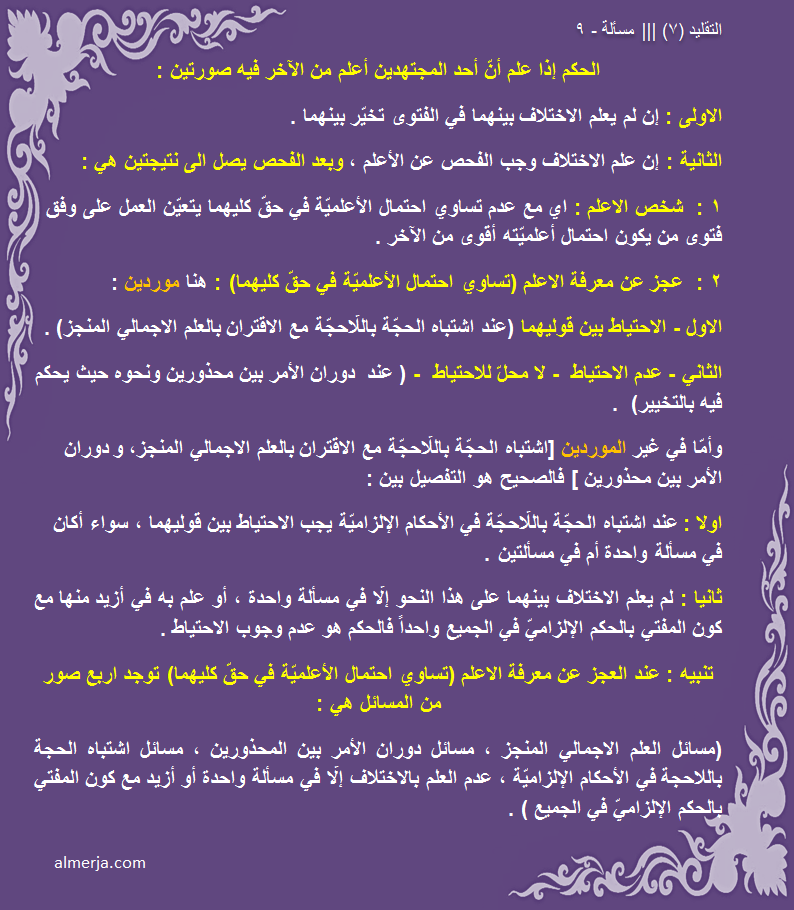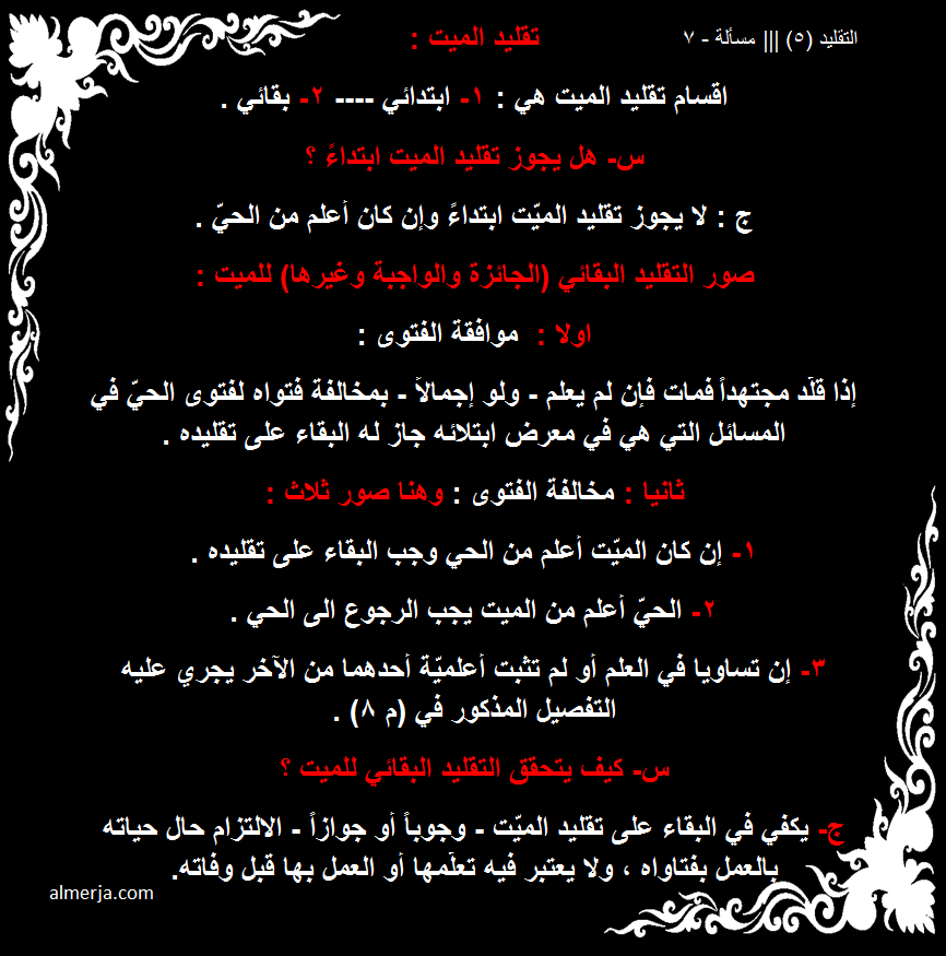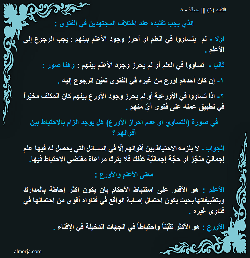 سيدي الجليل انا اقلد المرجع (س) وتوفى هذا المرجع ، قام مقامه المرجع (ص) وكان هو الاعلم بين الاحياء حسب شهادة اهل الخبرة ، فقصدك هنا ان اذهب اليه وان اسأله في بقائي على تقليد المرجع (س) بأعتبار المرجع (س) المتوفى اعلم من (ص) هذا هو المعنى المقصود ام معنى اخر؟؟ أعجبني