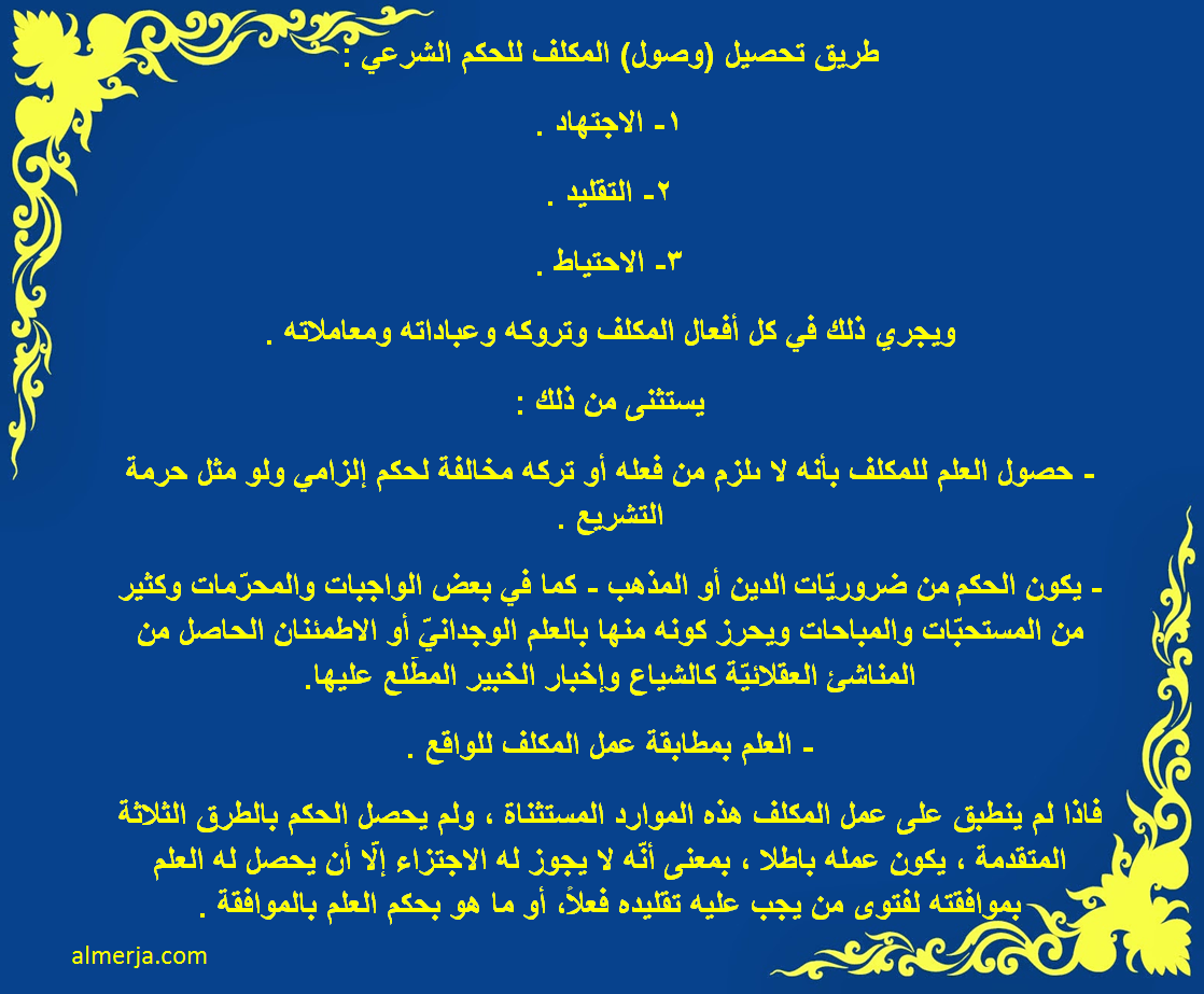 - حصول العلم للمكلف بأنه لا ‌‌ىلزم من فعله أو تركه مخالفة لحكم إلزامي ولو مثل حرمة التشريع .