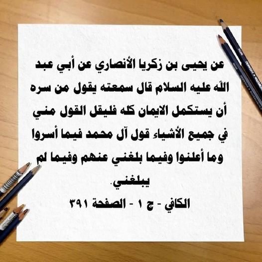 عن يحيى بن زكريّا الأنصاريّ عن أبي عبد الله (عليه السلام) قال: سمعته يقول: "مَن سرّه أن يستكمل الايمان كلّه فليقل: القول منّي في جميع الأشياء قول آل محمد، فيما أسرّوا وما أعلنوا وفيما بلغني عنهم وفيما لم يبلغني". * الكافي: ج1، ص 391 (مكتبة الشيعة).