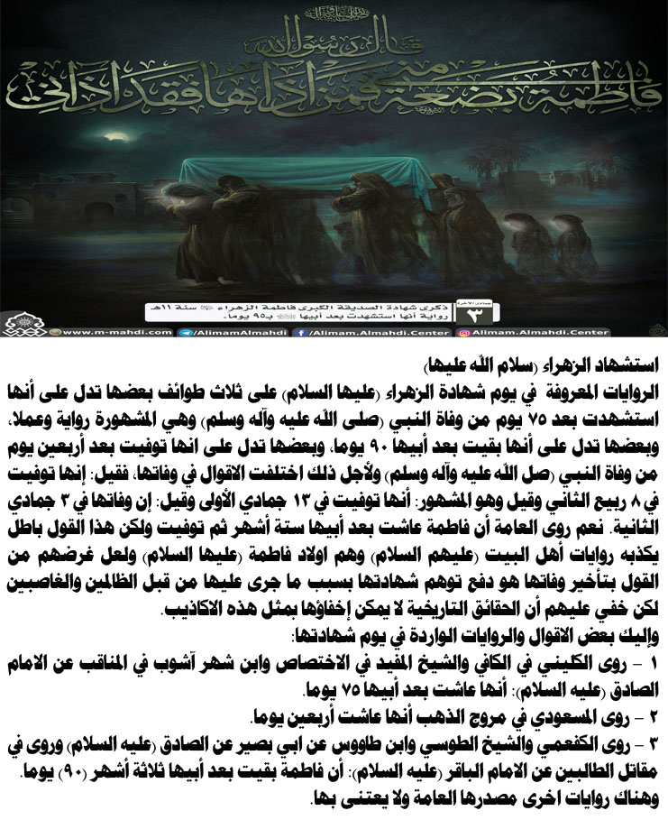 ولادة سيدة نساء العالمين (ع)// السيّدة فاطمة بنت محمّد(ص) بن عبد الله بن عبد المطلّب أُمّ الحسن، والحسنين، أُمّ الريحانتين، أُمّ الأئمّة، أُمّ أَبيها. من القابها الزهراء ،البتول ،الصدّيقة، المباركة،الطاهرة، الزكية، الراضية، المرضية، المحدّثة.. ولدة في 20 ج2 في السنة الخامسة للبعثة مكّة المكرّمة.أُمّها السيّدة خديجة بنت خويلد(رض)، وزوجها الإمام علي (ع)، كانت من أهل العباء والمباهلة والمهاجرة في أصعب وقت، وكانت فيمن نزلت فيهم آية التطهير، وافتخر جبرائيل بكونه منهم، وشهد الله لهم بالصدق ....