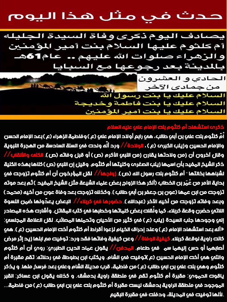 حدث في مثل هذا اليوم (21 جمادي الاخر) // ذكرى استشهاد أم كلثوم بنت الإمام علي عليه السلام