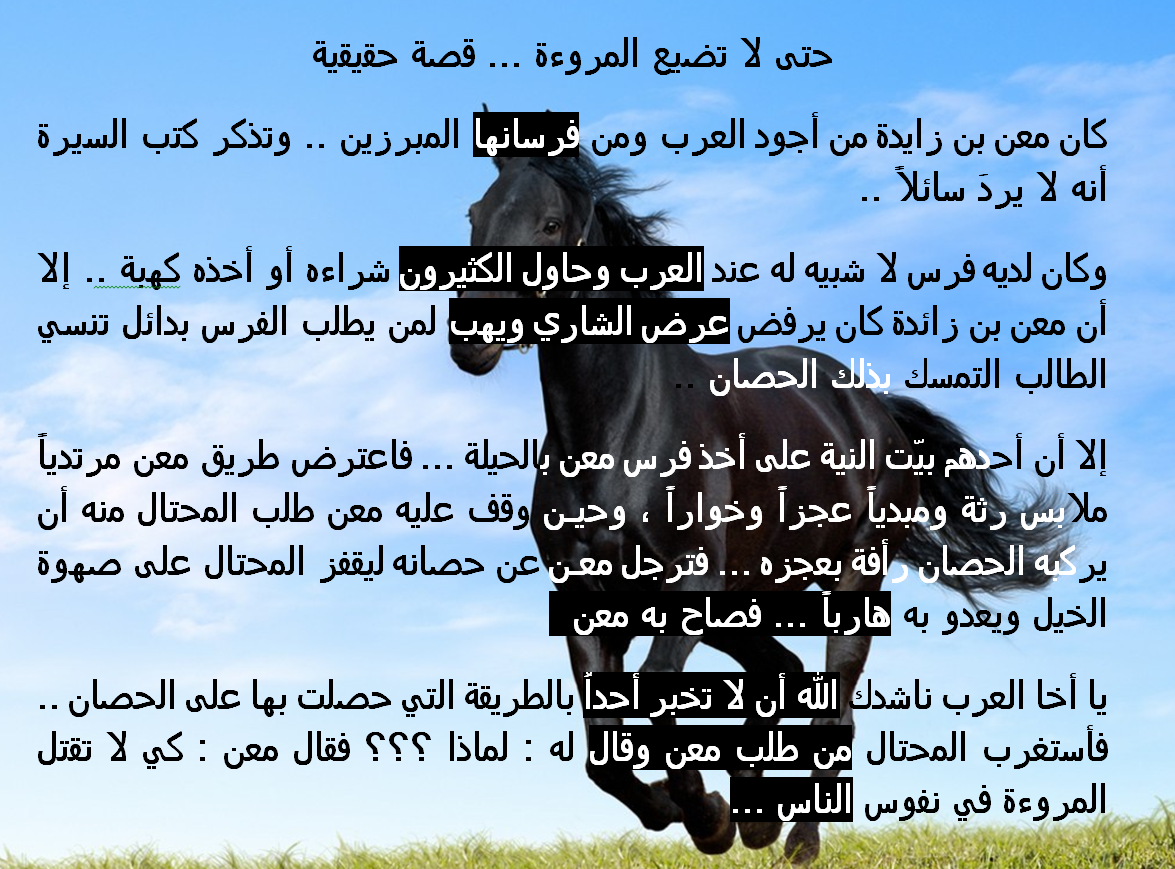 إلا أن أحدهم بيّت النية على أخذ فرس معن بالحيلة ... فاعترض طريق معن مرتدياً ملابس رثة ومبدياً عجزاً وخواراً , وحيـن وقف عليه معن طلب المحتال منه أن يركبه الحصان رأفة بعجزه ...