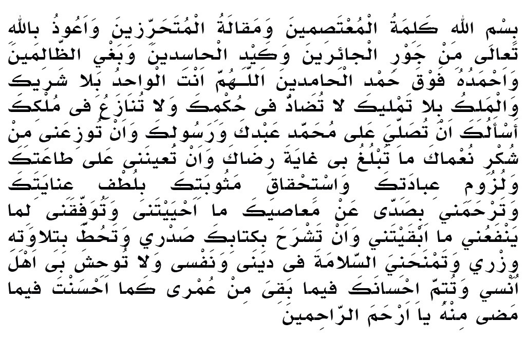 "رَبِّ أدخِلني في لُجَّةِ بَحرِ أحَديَّتِكَ وَطَمطامِ يَمِّ وَحدانيَّتِكَ وَقَوِّني بِقوَّةِ سَطوَةِ سُلطانِ فَردانيَّتِكَ حَتَّى أخرُجَ إلى فَضاءِ سَعَةِ رَحمَتِكَ وَفي وَجهي لَمَعاتُ بَرقِ القُربِ مِن آثارِ حِمايَتِكَ مَهيباً بِهَيبَتِكَ عَزيزاً بِعِنايَتِكَ مُتَجَلِّلاً مُكَرَّماً بِتَعليمِكَ وَتَزكيَـتِكَ".