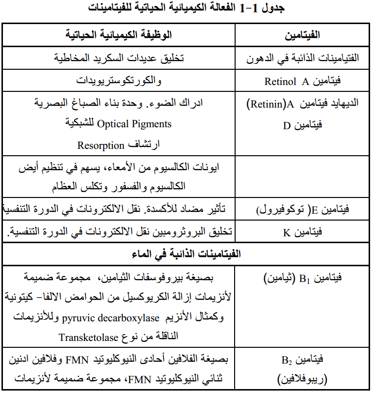 يقصد بالفيتامين،العامل الغذائي الجوهري الذي يحتاجه الكائن الحي بكميات قليلة والذي ينتج عن غيابه أمراض نقص معينة. إن الفيتامينات جوهرية للكائن الحي لأنه يستطيع تخليقها، وهي ضرورية للحياة. وتختلف الحاجة للفيتامينات باختلاف الكائنات الحية. يوضح الجدول 1-1 الفيتامينات التي يحتاجها الإنسان في غذائه ووظائفها الكيميائية الحياتية.