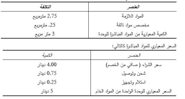 ﺗﺷﻣل ﻣﻌﺎيـيـر ﺗﻛﻠﻔﺔ اﻟﻣواد اﻟﻣﺑﺎﺷرة ﻧـوﻋيـن رﺋيـﺳـين ﻫﻣـﺎ ﻣﻌـﺎيـيـر ﻛﻣيــﺔ اﻟﻣـواد وﻣﻌـﺎيـيـر ﺳـﻌر اﻟﻣـواد واﻟﻛﻣيــﺔ اﻟﻣﻌيـﺎريـﺔ ﻣن اﻟﻣواد اﻟﻣﺑﺎﺷرة ﻫﻲ ﻛﻣيـﺔ اﻟﻣواد اﻟﻣﺑﺎﺷرة اﻟﺗﻲ يـﺟب إﺳﺗﺧداﻣﻬﺎ ﻟﻛل وﺣدة إﻧﺗﺎج وﻋﻧد وﺿﻊ ﻣﻌﺎيـيـر اﻟﻛﻣيـﺔ يـﺟب ﻋﻣل دراﺳﺔ ﻋﻠﻣيــﺔ وﺗﻧﻔيــذ ﻋﻣﻠيــﺎت القياس اﻟﻔﻧيــﺔ واﻟﻬﻧدﺳـيـﺔ وﺗﻌـديـل ﻧﺗـﺎﺋﺞ ذﻟـك ﺑﻌﻣـل اﻟﺗﺷﻐيـل اﻻﺧﺗﺑـﺎري وطبعاً ﻻﺑـد ﻣـن أﺧـذ اﻟظـروف اﻟﻌﻣﻠيــﺔ ﻓـﻲ اﻟﺣﺳـﺑﺎن ﻟﻠﺗأﻛـد ﻣـن المعيار وﻧﺳـﺑﺔ اﻟﻣـواد اﻟﺗــﻲ ﺳــيـﺗم ﻓﻘــدﻫﺎ ﻋﻠــﻰ ﺷــﻛل ﻋــﺎدم أو ﻓﺎﻗـــد ﻋــﺎدي (أﺛﻧــﺎء اﻟﺗﺧــزيـن أو اﻟﻣﻧﺎوﻟــﺔ أو اﻟﺗﺷــﻐيـل) أو ﺗﺑﺧـــر أو اﻧﻛﻣﺎش وﺗﺿﻣيـﻧﻬﺎ ﻓﻲ ﻣﻌيـﺎر اﻟﻛﻣيـﺔ ،اما معيار ﺳﻌر اﻟﻣواد ﻓﻬذا يـﺗم ﺣﺳـب اﻟﺳـﺟﻼت اﻟﺗﺎريـﺧيــﺔ ﻟﻠﺷـرﻛات وﺗوﻗﻌﺎﺗﻬﺎ ﻟﻸﺳﻌﺎر ﻓﻲ اﻟﻔﺗـرة اﻟﻘﺎدﻣـﺔ وﺑﻧـﺎء على ﻣﻌيــﺎر اﻟﺳـﻌر ﻟﻠﻣـواد يــﺗم ﺑﺎﻟﺗﻧﺳـيـق ﻣـﻊ داﺋـرة اﻟﻣﺷـﺗريـﺎت ويـﺟـب أن يـﺗﺿــﻣن اﻟﺳــﻌر اﻟﻣﻌيـــﺎري كاﻓــﺔ اﻟﺗﻛــﺎﻟيـف واﻟﻣﺻــﺎريـف ﺣﺗــﻰ وﺻــول اﻟﻣــﺎدة إﻟــﻰ اﻟﻣﺳــﺗودع ﻣــﻊ اﺳــﺗﺑﻌﺎد اﻟﺧﺻم اﻟﺗﺟﺎري وﺧﺻم اﻟﻛﻣيـﺔ .