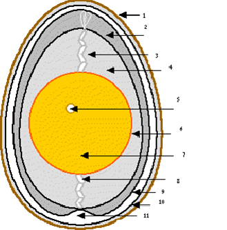 ١- القشرة ۲- البياض الخفيف الخارجي ۳- البياض السميك الأوسط 4- الالبيومين الخفيف الداخلي 5- القرص الجرثومي 6- غشاء المح ۷- الصفارة 8- الكلازا ۹- غشاء القشرة الداخلي ۱۰- غشاء القشرة الخارجي ۱۱- الغرفة الهوائية.