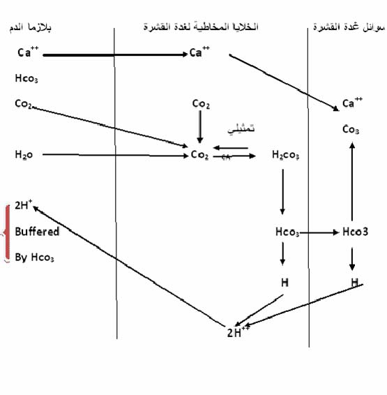 يوضح شكل رقم (6) التالي العلاقة بين أيونات الكالسيوم وكل من ثاني أكسيد الكربون وأيونات البيكربونات في بلازما الدم والخلايا المخاطية لغدة القشرة (الرحم) وسوائل الغدة.