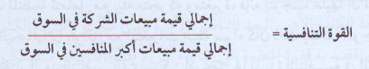 كما يمكن بذات الوقت قياس القوة التنافسية للمنظمة من خلال قوة مبيعات الشركة إلى أقوى المنافسين في السوق وكما يلي:
