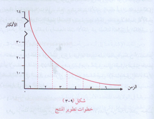 تمر عملية تطوير المنتج الجديد بعدد من الخطوات والتي قد تتعدد أو تتقلص تبعا لحدود التداخل أو الانفصال الواضح فيما بينها. ويمكن أن يوضح الشكل (٩-٣) هذه الخطوات وكيفية تتابعها، إذ يمثل الاحداثي العمودي عدد الأفكار والتي اتفق الباحثون على أن تصل إلى (٦٤) فكرة لتقديم منتج جديد. أما الاحداثي الأفقي فإنه يمثل الفترة الزمنية التي تغطيها هذه الخطوات أو المراحل لتقديم المنتج إلى السوق، وقد تطول أو تقصر هذه الفترة تبعاً إلى خصوصية المنتج المقدم ودرجة التعقيد فيه. وتتمثل خطوات تطوير المنتج بالآتي: