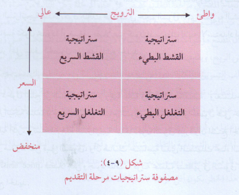 وعلى ضوء ذلك فإن المنظمة بإمكانها اعتماد عدد من الستراتيجيات التسويقية في هذه المرحلة تدور في محتواها على العلاقة ما بين السعر والترويج ليتحدد على ضوء كل واحدة منها الهدف الذي تسعى المنظمة إليه في هذه المرحلة والتي يمكن توضيح ذلك بالمصفوفة التالية في الشكل (٩-٤) والستراتيجيات المعتمدة هي :