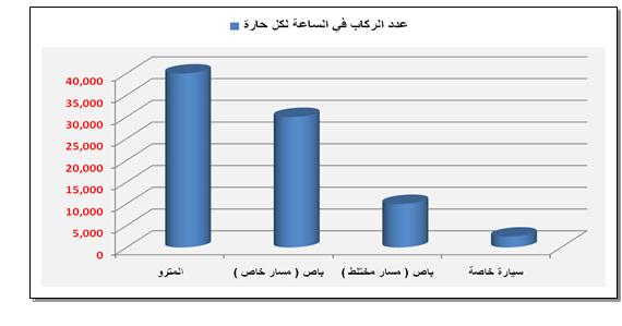 مقارنة بين النقل العام والنقل الخاص - المقارنة من حيث الطاقة الاستيعابية لعدد الركاب الممكن نقلهم في الساعة للحارة الواحدة ، بين وسائل النقل العام ( وهي الباصات أو الأوتوبيسات والمترو ) ووسائل النقل الخاص المتمثلة بالمركبات الخاصة ، حيث نجد أنه يمكن نقل 40,000 راكب بواسطة المترو مقارنة بالسيارات الخاصة التي تنقل حوالي 2,500 راكب فقط ، كما يلاحظ انه بواسطة المترو ايضا يمكن نقل اربع اضعاف عدد الركاب الممكن نقلهم عن طريق الباصات ، وذلك من خلال الشكل التالي :