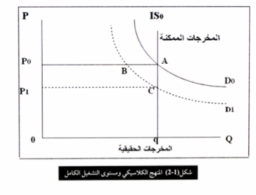ونص اعلام المدرسة الكلاسيكية على ان النقود ليست لها منفعة خاصة بها وان منفعتها مشتقة من منفعة السلع التي يمكن شراءها بواسطة النقود، لان النقود لا تطلب لفرض الاحتفاظ بها كأرصدة نقدية عاطلة بل تطلب لشراء السلع والخدمات، مما يعني اهمال دور الزمن في التحليل الاقتصادى وبالتالي استبعاد فكرة التوقعات والميل لاكتناز النقود لفترات طويلة من الزمن ومن ثم اغفال وظيفة النقود كأداة لحفظ القوة الشرائية، ونتيجة لذلك فان الزيادة في عرض النقد ستؤدي الى زيادة في المستوى العام للاسعار وبنفس النسبة، وان مستوى الانتاج الكل يتجه دائماً نحو المستوى الذي يحقق الاستخدام الكامل للموارد الانتاجية، فضلاً عن ان الاسعار والأجور تكون ذات مرونة تامة، وبافتراض انخفاض مستوى الطلب الكلي بسبب انخفاض كمية النقود فان منحنى الطلب الكلي بدوره سوف ينتقل نحو جهة اليسار كما في الشكل (1-2) عند مستوى السعر الأصلي (Po) فيهبط الانفاق من (A) الى المستوى (B)، وقد يُحدث خلال الفترة القصيرة هبوطاً في المخرجات، ولكن بعد انتقال منحى الطلب الكلي سرعان ما يتم انخفاض الاسعار والاجور وذلك الى المستوى(P1) تحت ضغط الزيادة في العرض، ومع انخفاض الاسعار فان المخرجات تعود الى مستوى المخرجات الممكنة وتستقر العمالة الممكنة عند النقطة (C)، ووفقاً لوجهة النظر الكلاسيكية، ان مرونة الاسعار والاجور تبقى محافظة وباستمرار على حجم الناتج وتعمل على تحقيق الاستخدام الكامل للعمالة بشكل تلقائي وان رؤيتهم في ذلك وللنقود بشكل خاص كانت رؤية سطحية اي مجرد ظاهرة ثانوية لا اهمية لها في العملية الاقتصادية على اعتبار ان حجم الناتج يتحدد بعوامل حقيقية وليس هناك من شأن للعوامل النقدية؛ وبالتالي فان النقود محايدة على التأثير في المتغيرات الاقتصادية الكلية الحقيقية عدا تأثيرها في المستوى العام للاسعار.