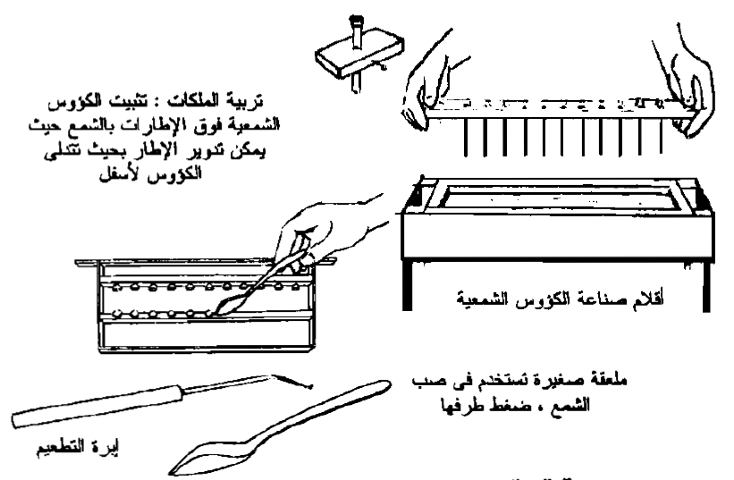 - أقلام صنع الكؤوس الشمعية ، وهي من الخشب الزان مستديرة القمة ، قطرها ثلاثة أثمان البوصة (0.95 سم )، وطوله 3 بوصة (7.6 سم )، وأحد أطرافه المستديرة على بعد نصف بوصة (1.25 سم)، ويستلق طرفه إلى ربع بوصة (0.6 سم)، ويمكن تثبيت مجموعة من الأقلام عددها من 15 - 16 قلما ، على أن تكون جميعها متساوية الطول والحجم ، وبين الواحد والآخر مسافة نصف بوصة ، تثبت في شريحة خشبية ، ويمكن عند غمسها في الشمع المنصهر عمل 15 - 16 كأسا في المرة الواحدة.