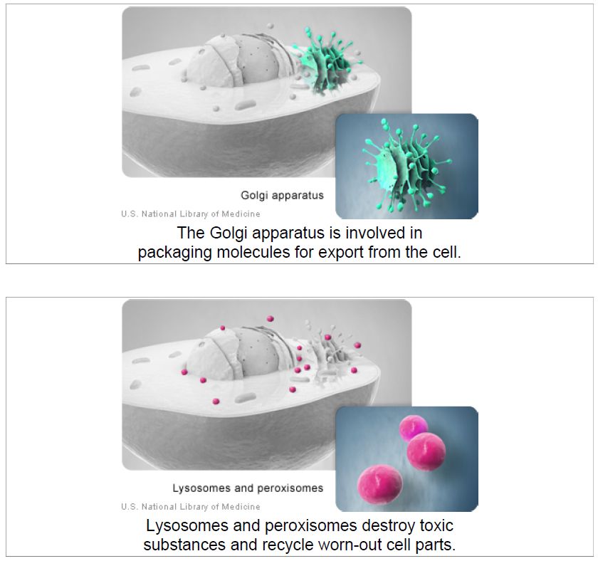 These organelles (image on page 8) are the recycling center of the cell. They digest foreign bacteria that invade the cell, rid the cell of toxic substances, and recycle worn-out cell components.
