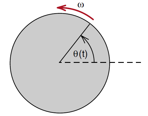 When thinking of angular velocity ω picture a line marked on the end of a rotating shaft. The angle θ is the angle that the line makes with the horizontal as shown in Figure (1). As the shaft rotates, the angle θ (t) increases with time, increasing by 2π every time the shaft goes all the way around.
