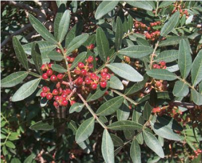 الصمغ الراتنجي أو المصطكى (mastic(resin، الأوراق، الثمار.