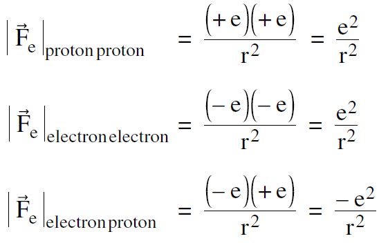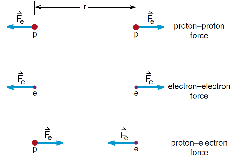 Figure 1: The electric interaction between protons and electrons at rest. There is no electric force on a neutron.