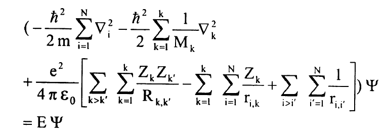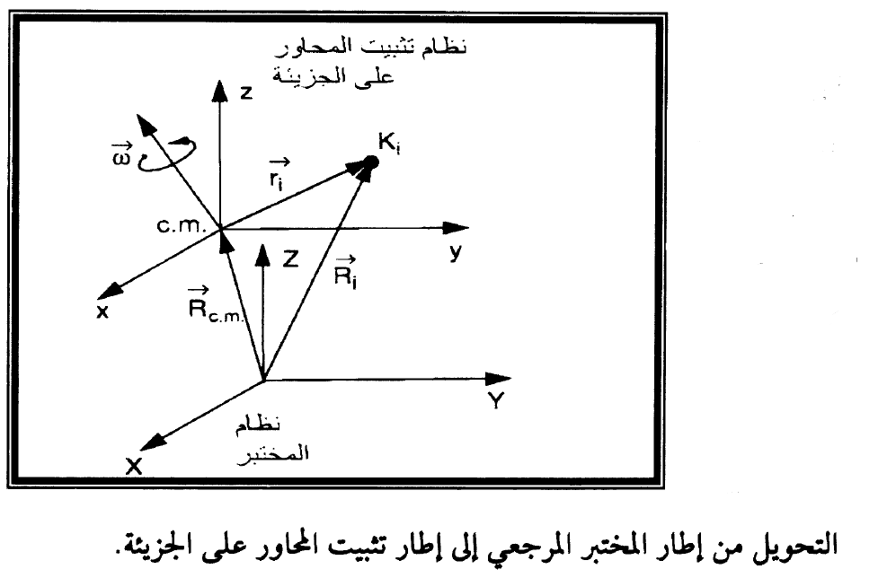 اذ تقع نقطة الاصل فيه في مركز كتلة الجزيئة ومحاوره مثبتة على اطار النوى في حالة الاتزان molecule-fixed بحيث تدور مع الجزيئة، وقد صيغت معادلة شرودنجر (1) في اطار المختبر المرجعي المرتبط مع الاطار المرجعي المثبت على الجزيئة السابق الذكر بعلاقة تحويل احداثيات ملائمة، ونبدأ بتحويل احداثيات الطاقة الحركية الكلاسيكية الى الاطار المرجعي المثبت على الجزيئة السابق الذكر ولا يتغير شكل الطاقة الكامنة بتحويل الاحداثيات لانها تعتمد على الاحداثيات النسبية لذلك.