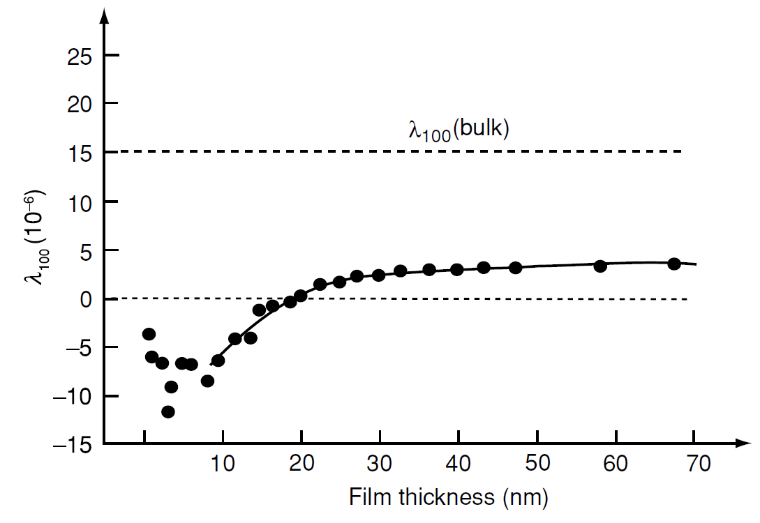 The intrinsic magnetic properties – magnetization, Curie point, anisotropy, magnetostriction – may differ appreciably in thin films and bulk material. As an example, the magnetostriction of iron, shown in Fig. 1, changes sign at a film thickness of 20 nm, and it approaches the bulk value only in films a few tens of nanometres thick. Many of these differences result from the special environments of surface and interface atoms, and the strain induced by the substrate. The lattice parameters of a perfectly relaxed film will differ from those of the bulk. In 3d metal films, the separation of the surface planes tends to be a few per cent greater than in the bulk. Surface atoms are missing some of their neighbours, so their vibrational amplitude is enhanced and exchange