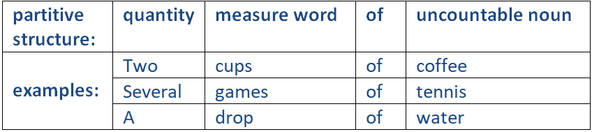 To count or quantify an uncountable noun we use a unit of measurement - a measure word. For example, we cannot usually say “two breads” because “bread” is uncountable. So, if we want to specify a quantity of bread we use a measure word such as “loaf” or “slice” in a structure like “two loaves of bread” or “two slices of bread”. We call this structure a partitive structure.