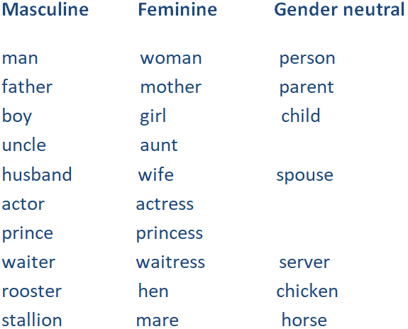 In general, there’s no distinction between masculine and feminine in English language. But sometimes we show gender in different words when referring to people or animals.