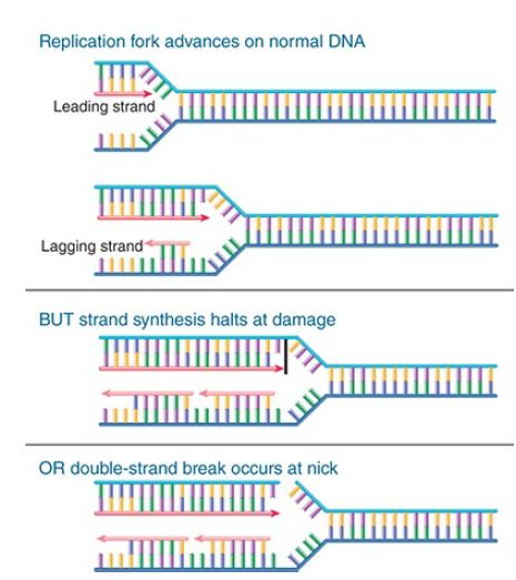 That will allow the cell to return to the lesion to repair it. FIGURE 1. compares an advancing replication fork with what happens when there is damage to a base in the DNA or a nick in one strand. In either case, DNA synthesis is halted, and the replication fork either is stalled or is disrupted and collapses.